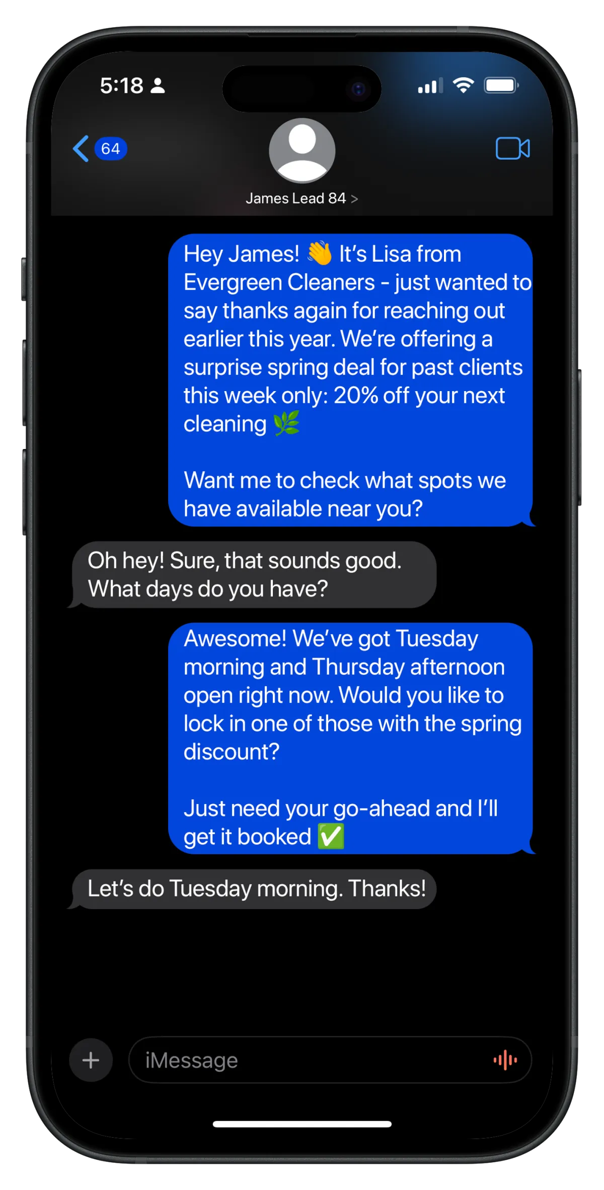 Perfect! Our system handles the repetitive follow-up work, freeing your staff to focus on high-value tasks and providing excellent customer service when clients arrive.